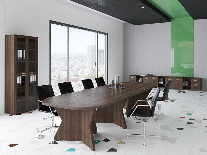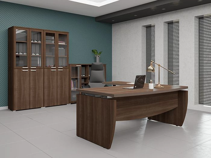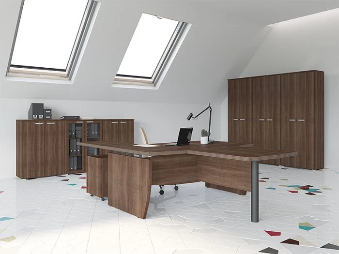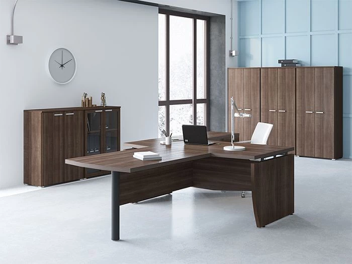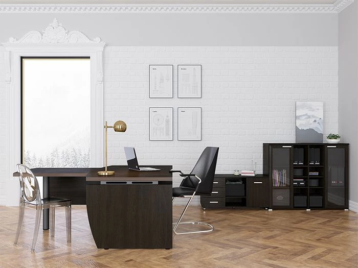 Кабинет руководителя Смарт Директор можно заказать в двух цветах: грецкий орех табак и грецкий орех табак венге. Оба цветовых решений довольно темные, поэтому их необходимо будет «разбавить» светлыми элементами декора или штукатуркой или обоями в светлых тонах.